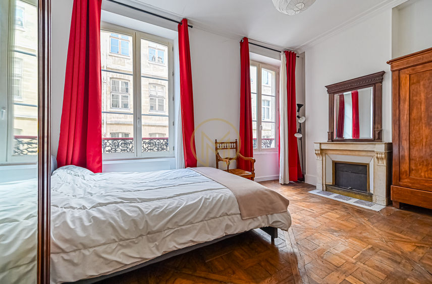 - Pièce de vie: généreuse et baignée de lumière grâce à ses grandes fenêtres. Elle bénéficie d’une belle hauteur sous plafond et d’éléments anciens préservés, notamment un parquet en point de Hongrie et une cheminée décorative, qui confèrent à l’ensemble une atmosphère chaleureuse et élégante. Le volume permet d’aménager aisément un espace nuit confortable ainsi qu’un coin salon ou bureau.