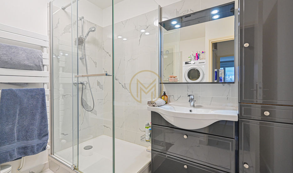 L'entrée s'ouvre sur une cuisine indépendante, moderne et entièrement équipée, ainsi qu'un vaste double séjour lumineux, orienté Est, donnant sur une agréable terrasse de 24 m² sans vis-à-vis.