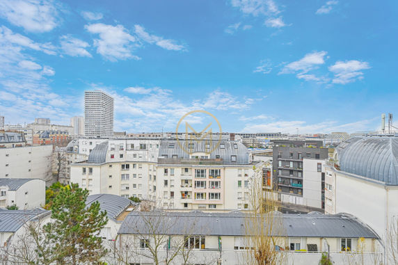 L'appartement bénéficie d'une belle vue dégagée sur les toits, d'une lumière naturelle abondante et d'un plafond cathédrale culminant à 4,20 mètres de hauteur.
